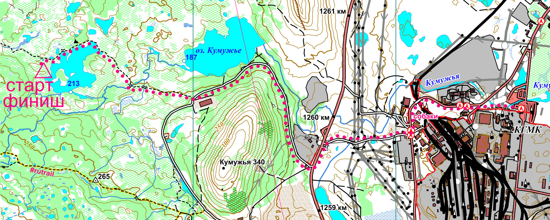 Старт Кольского марш-броска-2024 состоится 9-11 августа на западном берегу озера 213, в 4 км от федеральной трассы Р-21 Кола (1259.5 км) и в 6 км от конечной остановки "КГМК" мончегорских городских автобусов. Координаты: N67.94187° E32.75080°. Путь от автобуса вначале не очень приятный: идти по тропе вдоль забора КГМК, по асфальту через мост над железной дорогой, перед электроподстанцией повернуть направо и дойти по хорошей грунтовке до трассы Кола. По трассе Кола 250 м на юг до конца промышленной территории и направо по сильно разбитому асфальту вокруг Кумужьей сопки. Начало тропы – на повороте дороги, вблизи развалин хлорного склада; ориентир – шины под откосом. До этого места можно доехать на машине или уговорить таксиста, если он согласится ехать по разбитой дороге. Далее 2 км пешком по тропе до конца озера 213 и 150 м на юг (см. карту). Точка старта – на гряде, под высокой двойной сосной.