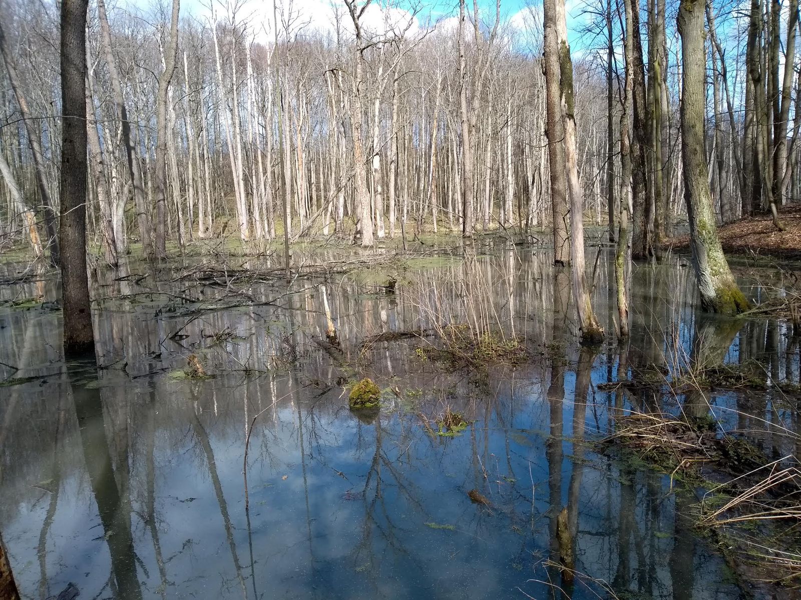 Сейчас, после нескольких снеговых и дождевых паводков, в районе очень много воды. Почти каждый овраг представляет собой ручей, а многие ручьи стали труднопредолимыми вброд (но брёвен для перехода хватает). Вода мутная, особенно там, где поработали бобры. Некоторые родники затоплены прилежащими ручьями. Мы не рекомендуем пить сырую воду – по возможности кипятите её.