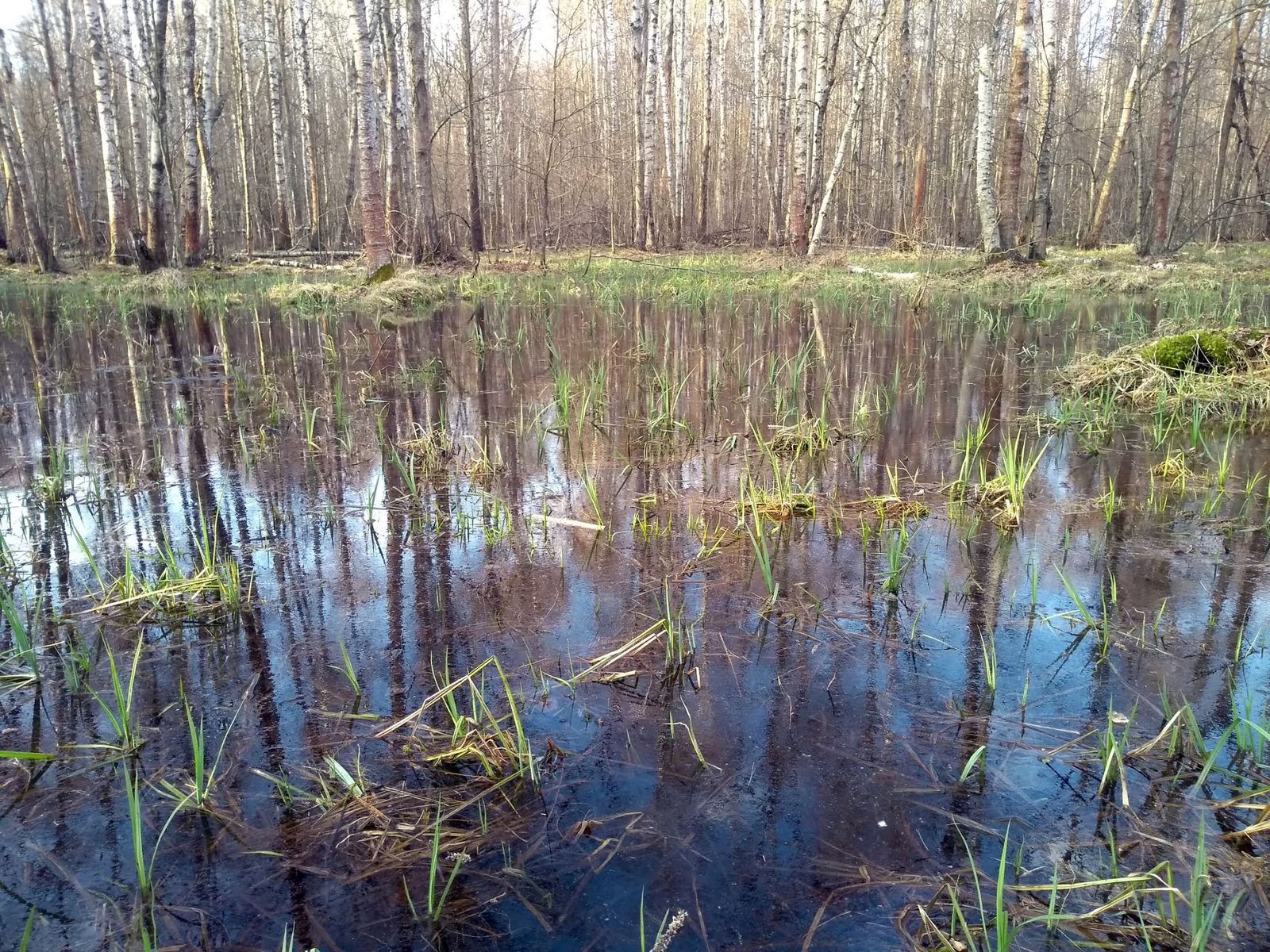 Сейчас, после весенних и дождевых паводков, в районе много воды, подсыхает она медленно. Болота все мокрые, некоторые низины подтоплены. Многие ручьи и речки запружены бобрами. Глубоких бродов обычно не требуется – переправы по брёвнам и бобровым плотинам. Вода, как правило, мутная, особенно там, где поработали бобры. Но есть и чистые родники и ручьи в лесных оврагах. По возможности кипятите воду перед употреблением.