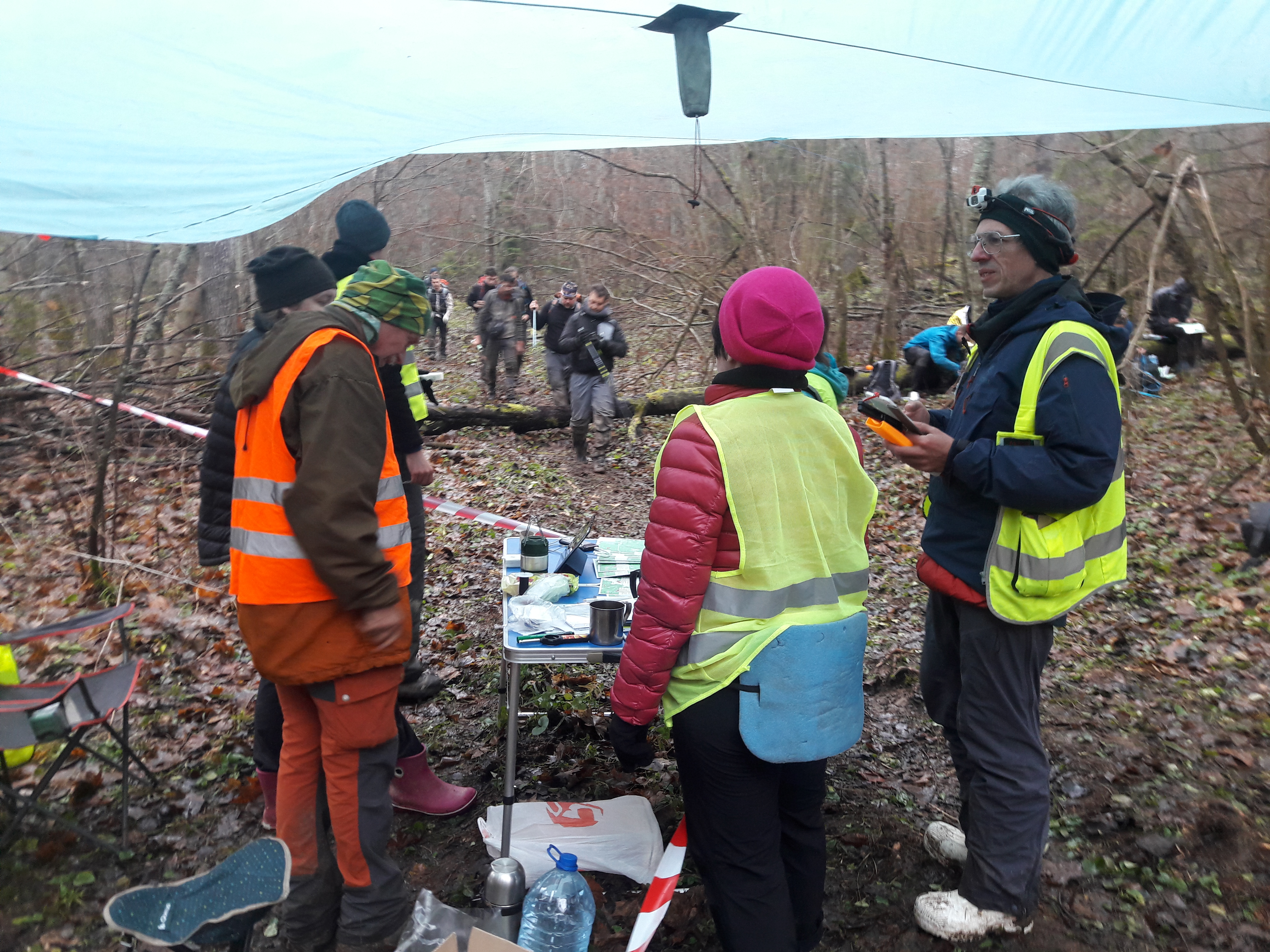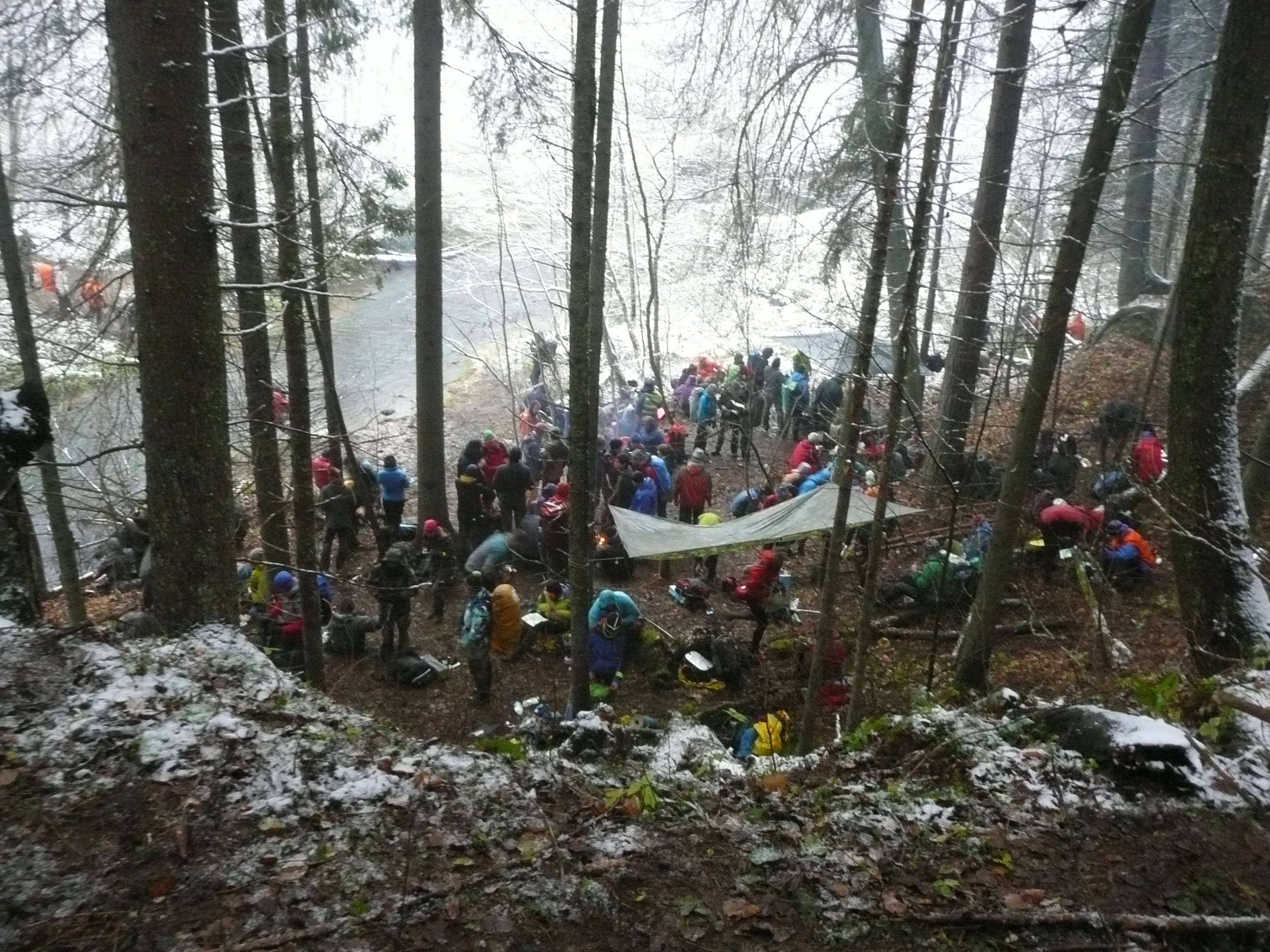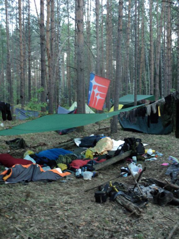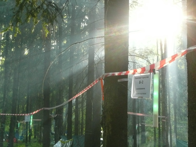 Всё началось в 2013 году, когда толком не было навигации, инфраструктуры, зонирования, внешнего отличия между судьями и участниками. Участники просто усеивали лес и пришедшим поздно было вообще тяжко найти место. Постепенно появлялись подходы к воде, судейская зона, иногда дрова, чай и костер участников — но это был не город, а скорее зачатки инфраструктуры. Ну очень надо, чтобы не мутили воду выше водозабора, поэтому делали маркировку.